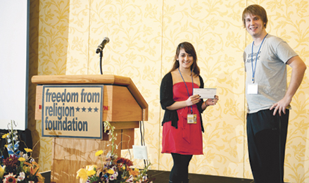 Jessica Ahlquist, 16, who is a plaintiff in an ACLU federal lawsuit to force removal of an 8-foot-tall prayer banner from her Rhode Island high school, spoke at FFRF’s 34th national convention Oct. 8, 2011, in Hartford, Conn., where she received the Thomas Jefferson Youth Activist Award of $1,000. This award is endowed by a West Coast couple. The painting was donated to Cranston West by the class of 1963, the first graduating class.