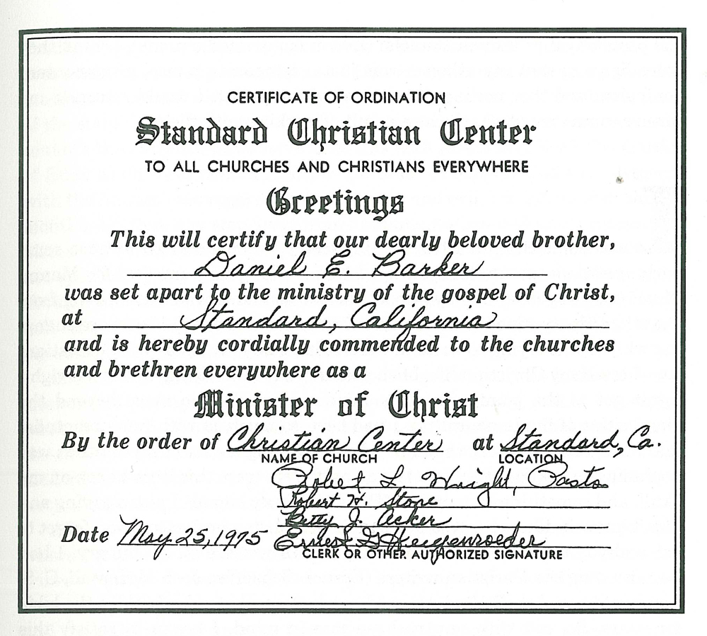 He became a teenage evangelist at age 15. At 16 he was choir librarian for faith-healer Kathryn Kuhlman’s Los Angeles appearances. He received a degree in Religion from Azusa Pacific University and was ordained to the ministry by the Standard Community Church, California, in 1975. (See ordination.) He served as associate pastor in three California churches: Arcadia Friend’s Church (Quaker), Glengrove Assembly of God (Hacienda Heights), and Standard Christian Center, an independent Charismatic church loosely affiliated with the Christian Church (Disciples of Christ tradition) in Standard, California. Dan was a Protestant missionary in Mexico for a total of two years.