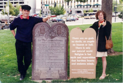 | Dan Barker and Anne Gaylor in Denver at the site of one of the Foundation’s challenges of Ten Commandments on public property. Attorney Robert Tiernan, who brought the Colorado challenge and several others for the Foundation, sent this note: “To Anne Nicol Gaylor: The most thoughtful, supportive, understanding and best client I have ever represented in my 45 years of practicing law. It has been a wonderful experience.” |