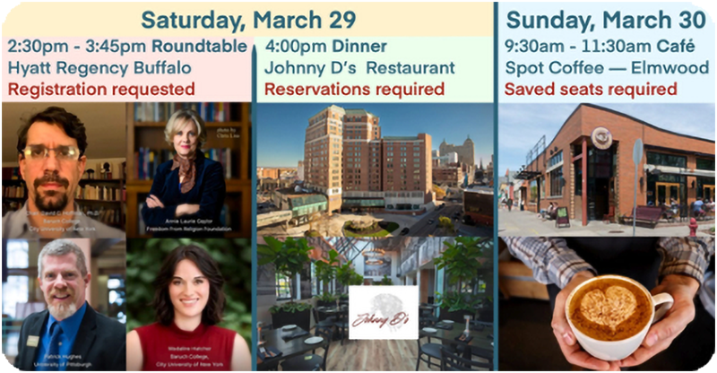 Choose to attend one, two, or all three of these events! Free stickers, buttons, bookmarks, the Freethought Today newspaper, and brochures will be waiting for you to take home and share with friends. A roundtable will be led by David Hoffman, Ph.D., the author of American Freethought: The History of a Social Movement, 1794-1948, who is also a participant of Upstate New York Freethinkers. This will be a great time for history buffs, legal minds, and anyone concerned about religious liberty. After the roundtable, we will have a chapter gathering dinner and the next morning a cafƩ meetup. We hope to see you there!
