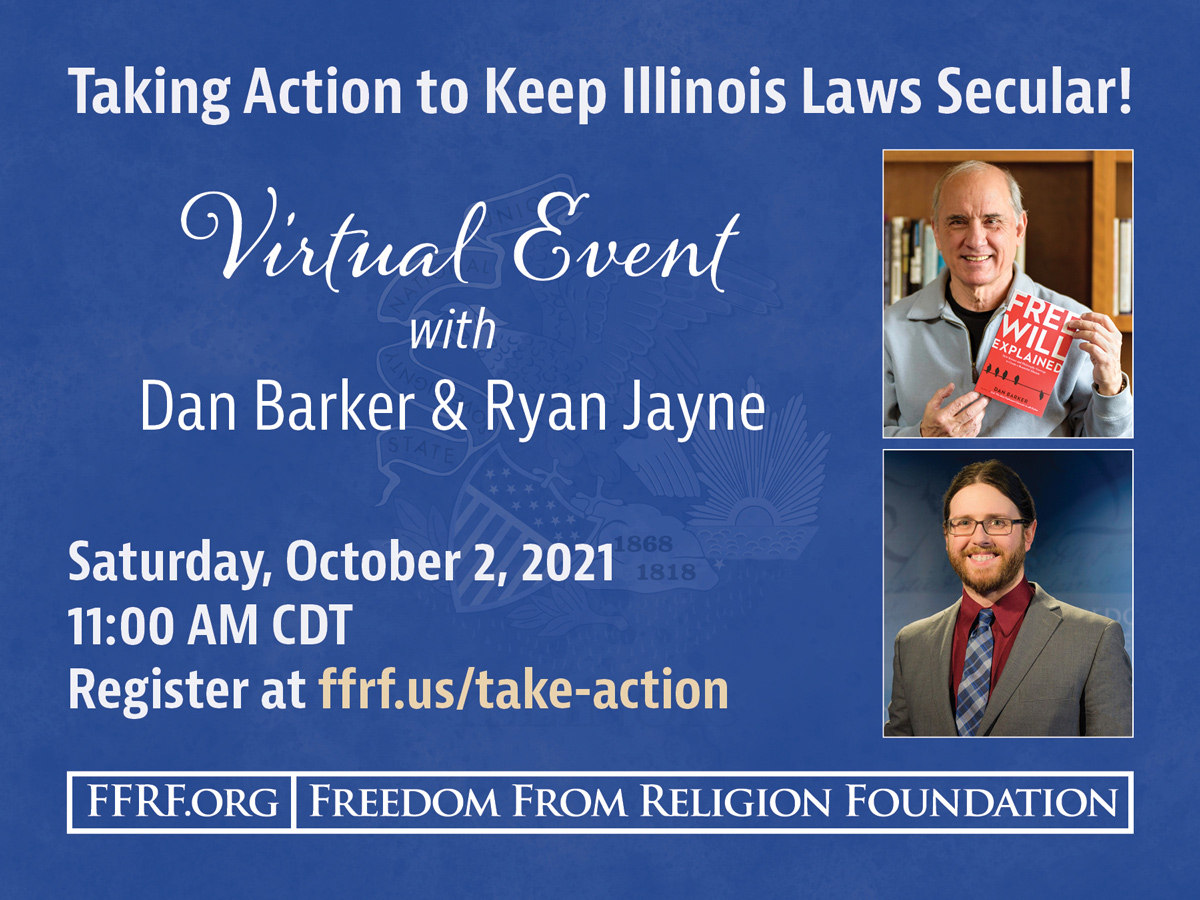 FFRF co-president Dan Barker will debate Rabbi Barry Silver on the question of “Does religion still serve a useful purpose in the modern world” on Wednesday, August 18 at 7:00 p.m. via Zoom.