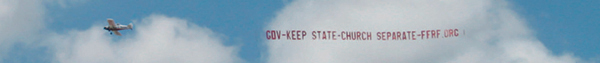 Foiled in court, FFRF responded by protesting at the event. Every billboard company in the area refused to lease a billboard to FFRF for a message critical of Perry’s involvement. So FFRF negotiated for a mobile billboard to circulate at the stadium all day with the message, “Beware Prayer by Pious Politicians — Get Off Your Knees and Get to Work!” It also commissioned an aerial banner (see photo at top), saying: “GOV – KEEP STATE/ CHURCH SEPARATE. FFRF. ORG.”