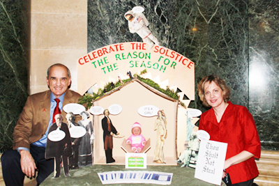 FFRF protested a devotional nativity on display in the Wisconsin State Capitol for the first time by seeking a permit to place its own “anti-creche.” Pictured: FFRF Co-Presidents Dan Barker and Annie Laurie Gaylor.