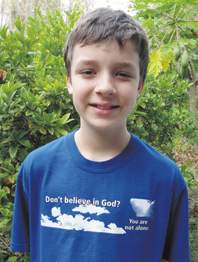 Pamela Hatley and her husband are Foundation members. Their son, Joe, in his first year of middle school, wore a shirt to school one day with a Florida Atheists logo on the back. The front said, “Don’t believe in God? You are not alone.”