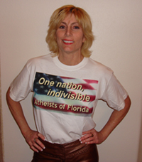 Earlier, when the meeting opened, the atheists stood with the rest of the citizens to recite the Pledge of Allegiance. It apparently irked some council members that the heathens skipped right past “under God” to “indivisible” and said it too loudly to suit the religionists. After a break in the meeting after the ejection, the council voted 6-2 to let Kieffer speak while wearing the same shirt.