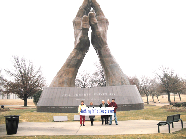 FFRF Co-President Annie Laurie Gaylor’s December visit to Tulsa, Okla., included a stop at Oral Roberts University. The six-story, 30-ton bronze sculpture named “The Healing Hands” was cast in 1980 in Juarez, Mexico, and then installed at the evangelist’s City of Faith Medical and Research Center (one hand represents prayer, the other medicine). When the hospital went broke in 1989, the statue was moved to its current home at ORU.