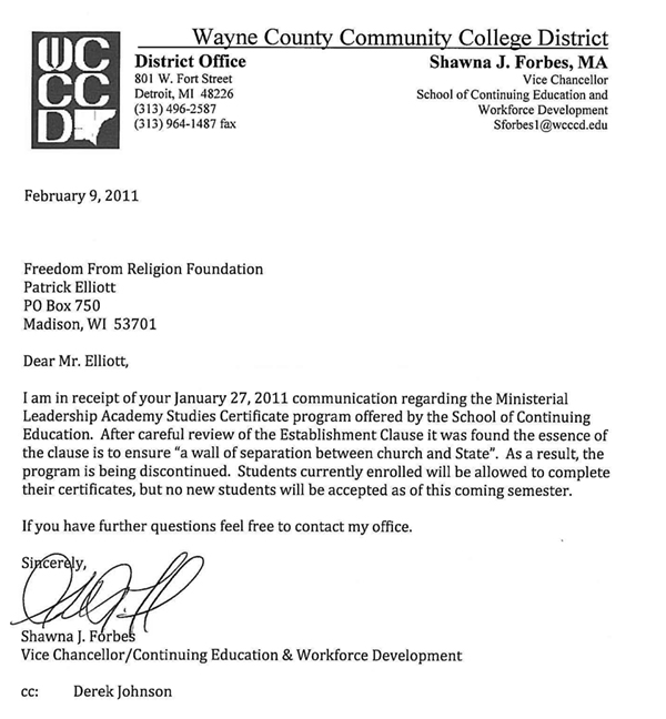 On Jan. 27, FFRF Staff Attorney Patrick Elliott wrote Chancellor Curtis Ivery of the Wayne County Community College District, which has campuses in and around Detroit, to request an end to the publicly funded district’s Ministerial Leadership Academy Studies Certificate program. Classes include “Introduction to Christian Education,” which taught students “to become a strong Christian witness.” The “Personal Relationship and the Word” class is described as helping students “develop stronger Bible based relationships with God.” The district agreed (see response above) that the program violates the U.S. and Michigan constitutions.
