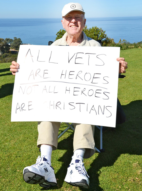 FFRF member Patrick O’Reiley counter-protested at a Feb. 9 rally of supporters of the Mount Soledad cross in La Jolla, Calif. Patrick and others gathered to support the 9th Circuit’s decision a year ago ordering removal of the cross. The Liberty Counsel, a Religious Right legal group, has appealed to the Supreme Court to take the case, which has been going on for more than 20 years. Courts have consistently found the huge religious symbol on public land unconstitutional, with backers of the Latin cross belatedly attempting to portray it as a “war memorial.” Congress interceded to “save the cross.” Congratulations to FFRF’s Life Member/Board Member Steve Trunk, principal plaintiff in the continuing saga, who is a vet and atheist. He became plaintiff after original litigant Phil Paulson, also a vet, died. Both Phil and Steve have been awarded FFRF’s Atheist in Foxhole award. See their speeches about the case at: