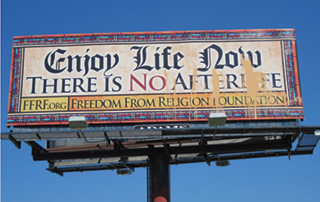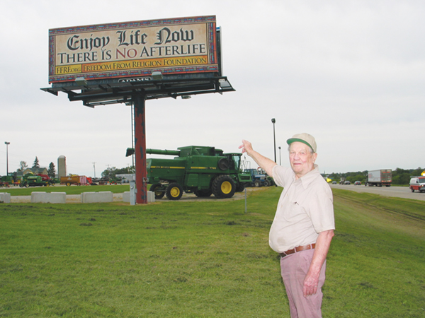 As you drive north into Watertown, Wis., on Highway 26 by the John Deere dealership, Wayne Hensler’s philosophy greets you: “Enjoy Life Now. There Is No Afterlife.” The 82-year-old farmer sponsored the billboard (with FFRF’s logistical help) as one of his legacies to his nine grandchildren and six great-grandchildren.