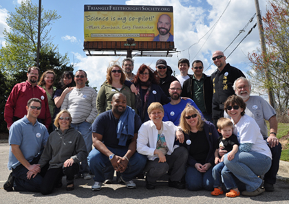 FFRF Raleigh chapter members in front of the chapter president’s billboard.
