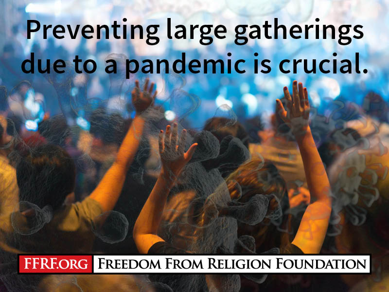 The Freedom From Religion Foundation is cautioning 17 governors around the nation that the exemptions they’ve granted to religious gatherings from prohibitory orders could have dire consequences.