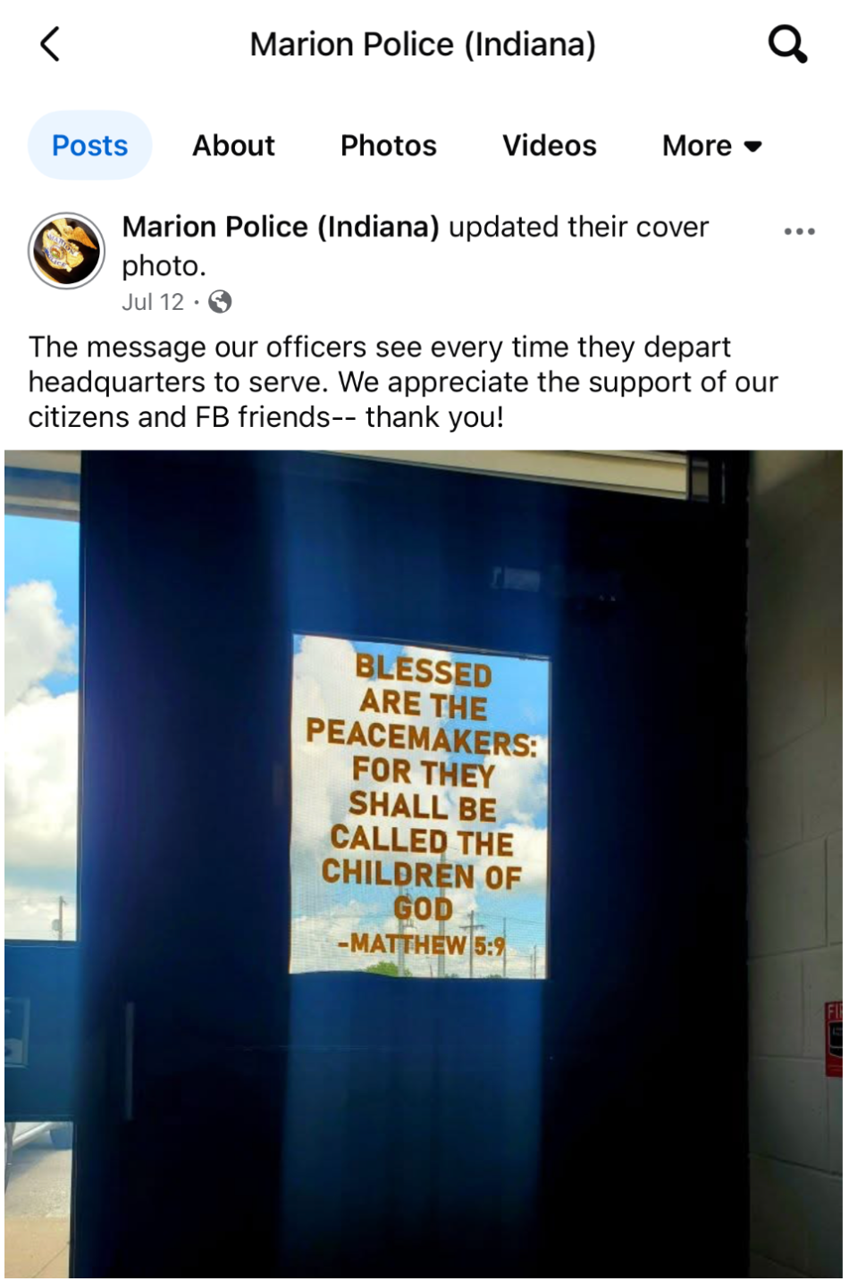 A concerned community member informed FFRF that the police department displays a bible verse at its main police station, advertised by the department’s social media as “the message our officers see every time they depart headquarters.” The verse reads: “Blessed are the peacemakers: for they shall be called the children of God. – Matthew 5:9.”