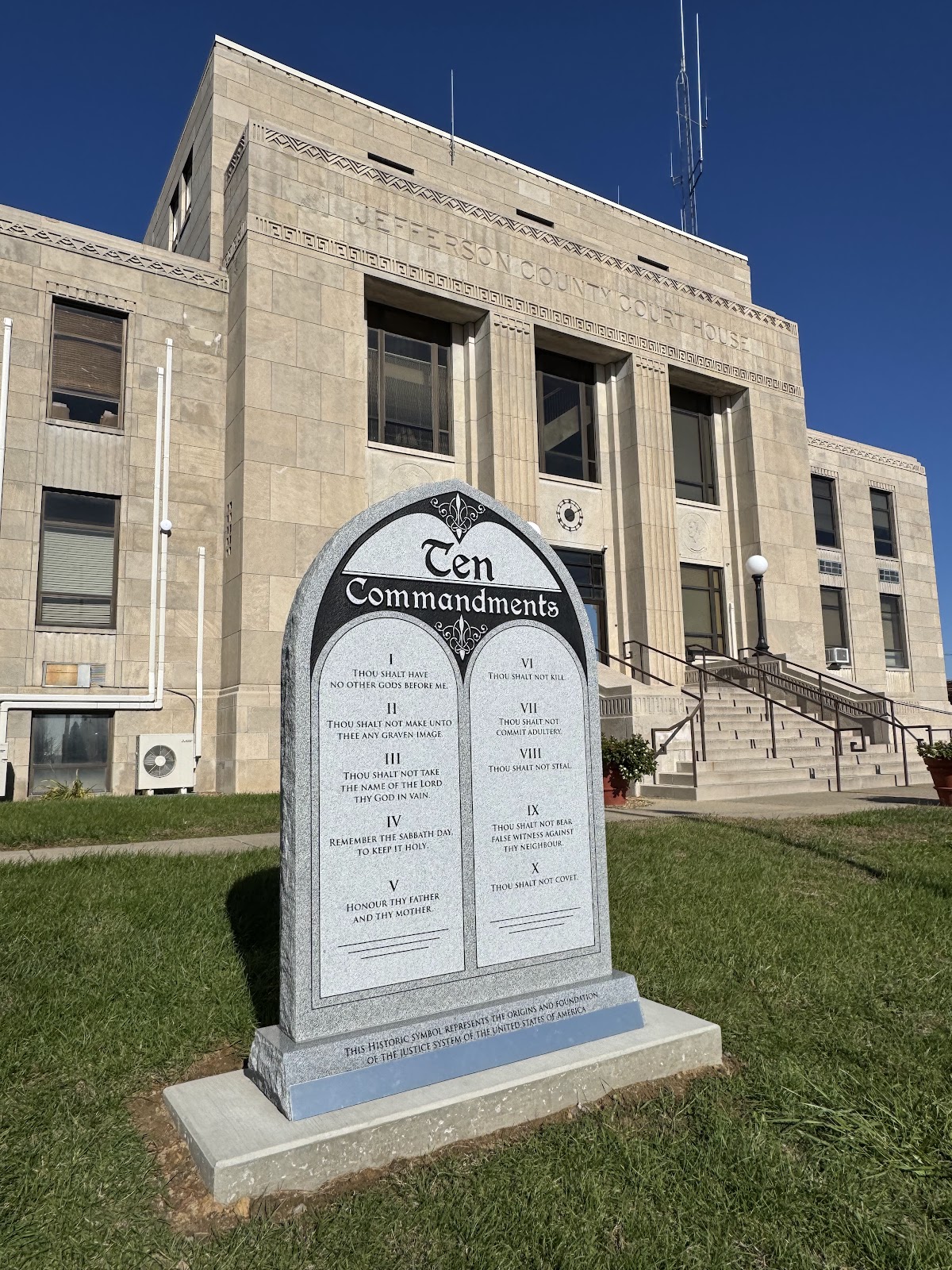 Originally placed in the courthouse lobby last year by Jefferson County Sheriff Jeff Bullard, the monument was later moved to the lawn immediately outside the courthouse entrance. While Bullard claimed that the original display was funded by private donations, the lawsuit alleges that he used public dollars to relocate the monument to its current outdoor location, where it is unavoidable for anyone who enters or passes by the courthouse. The monument enumerates a Protestant version of the Ten Commandments.
