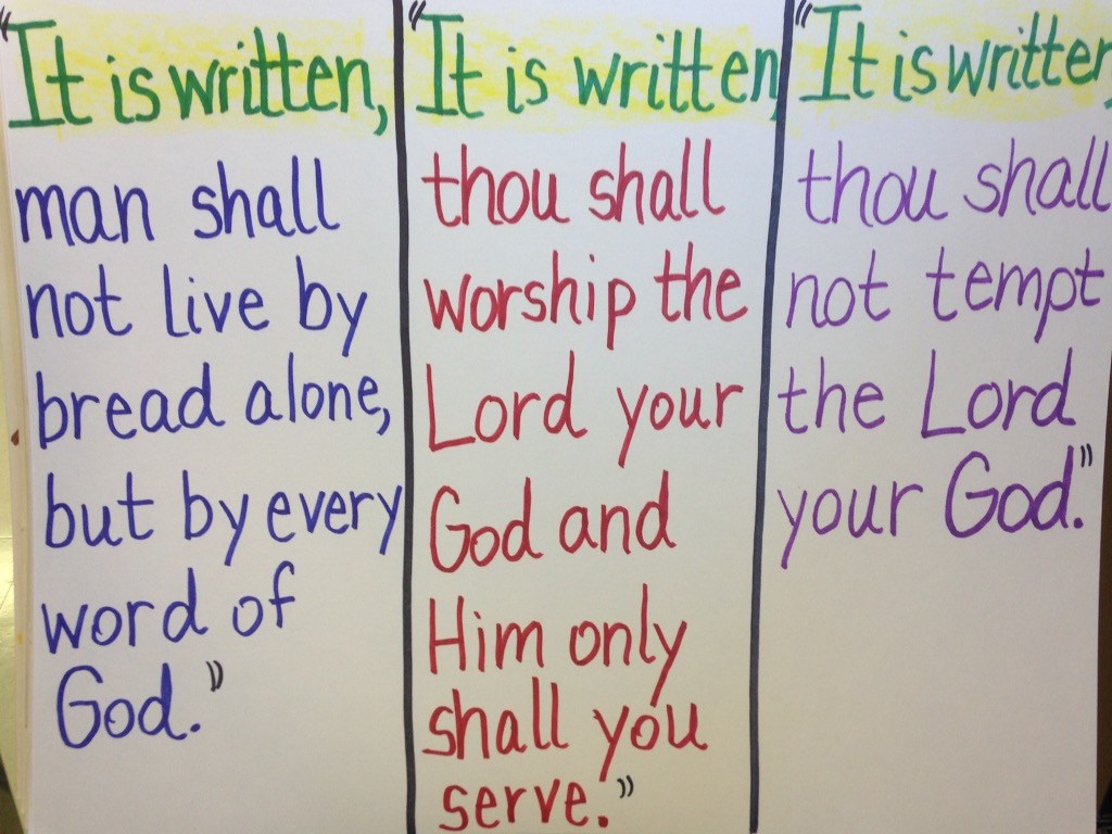 A lesson titled “Jesus in the Wilderness” told of Jesus resisting temptations from the devil and responding with affirmations of faith in God. These statements were written out for the students on a visual aid used in class.