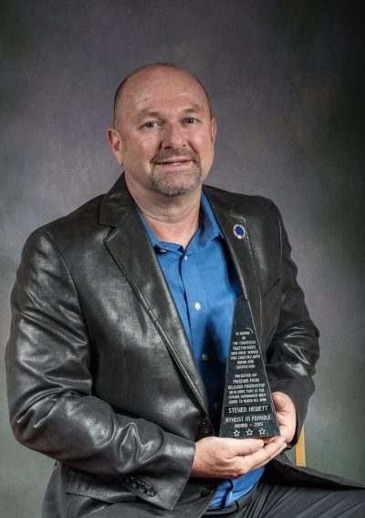 Steven Hewett will be honored with FFRF’s Atheist in Foxhole Award. The former police officer and Afghanistan war veteran returned home with a Combat Action Badge and Bronze Star, only to find a Christian flag flying at the Veterans Memorial in King, N.C. In December, following a long court battle taken on his behalf by Americans United, the city agreed to stop flying the Christian flag and to remove a cross from a kneeling soldier statue. Steven is a Lifetime FFRF Member.