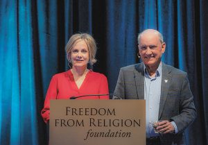 Bonnie Garmus was on hand to accept FFRFās Emperor Has No Clothes Award. Garmusā charming and thought-provoking novel, “Lessons in Chemistry“, has sold in the multimillions. The award-winning global phenomenon, which has been translated into 42 languages and has been on the bestseller list for more than a year, was recently turned into a series on Apple TV starring Brie Larson. The novel, part romantic comedy and part satiric commentary, is about a determined chemist who encounters so much sexism in the 1950s that she turns to hosting a highly scientific TV cooking show. While the bookās feminism has been much remarked upon, almost every main character in it is a pronounced atheist.