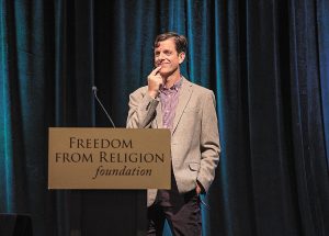 FFRF Co-President Dan Barker, besides doing a little entertaining at the piano, spoke on his brand new book, “Contraduction: The Death of the Design Argument”. After 140 debates for FFRF, Dan proposed a new way of looking at assumptions behind “fine-tuning” arguments for the existence of God. He’s the author of other books, including “God: The Most Unpleasant Character in All Fiction“, “Godless“, “Life Driven Purpose“, “The Good Atheist“, “Just Pretend: A Book for Young Freethinkers“, “Losing Faith in Faith: From Preacher to Atheist“, and “Free Will Explained“.