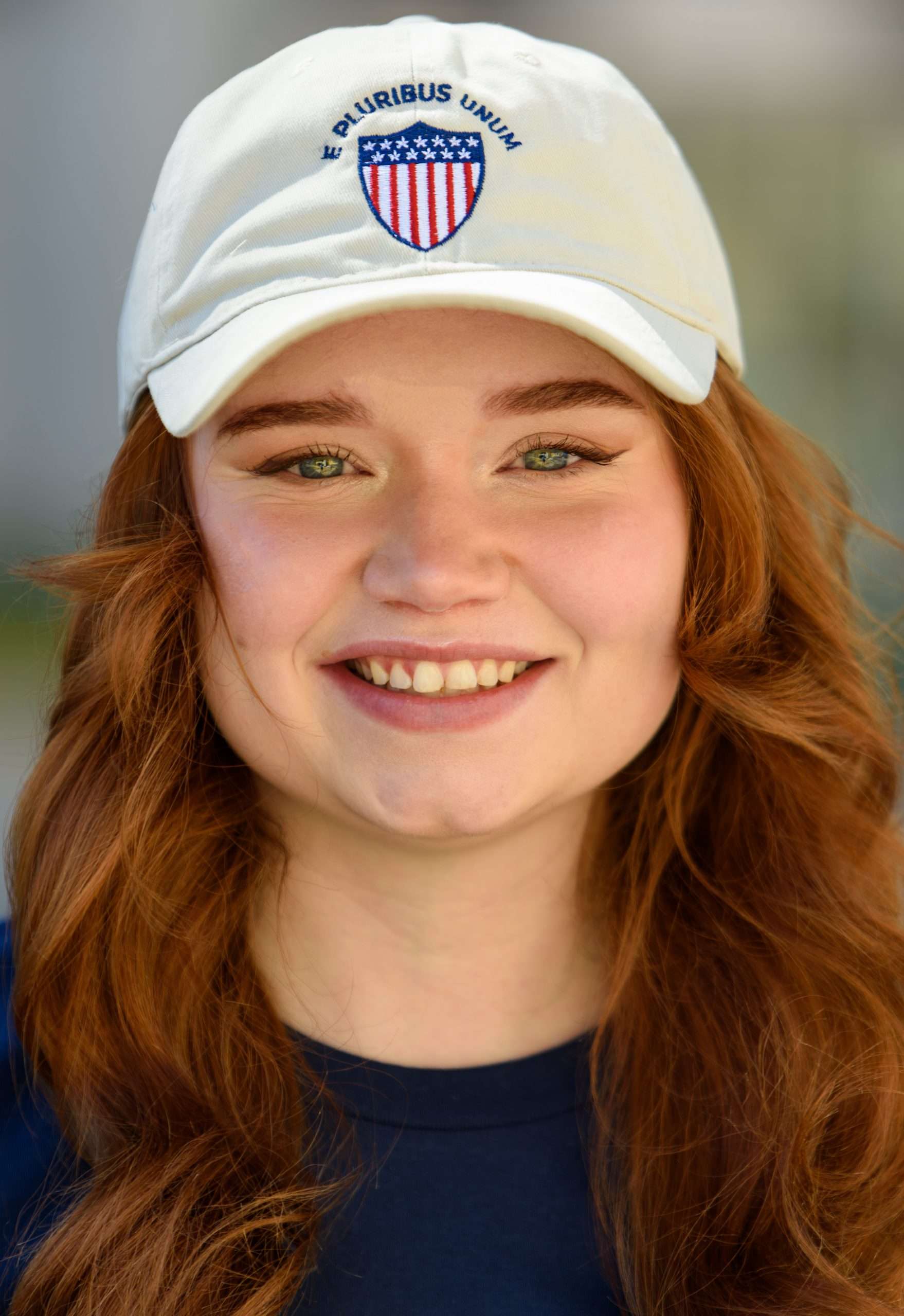 Unstructured stone-colored cap with red, white, and blue embroidery. 100% cotton.