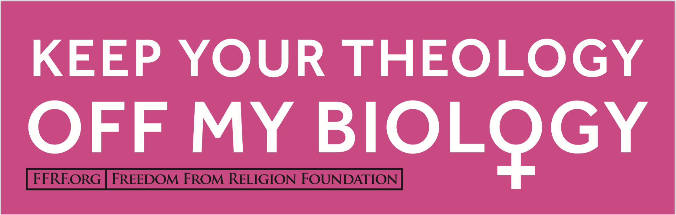 Bumper sticker on hot pink background with white text. Timely message about religion’s encroachment upon reproductive rights.