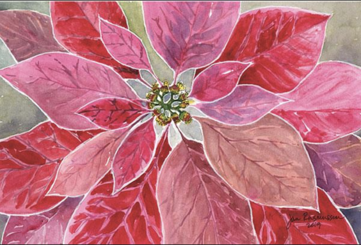Original watercolors donated by artist Jan Rasmussen. Greeting: Wishing You a Serene Winter Solstice Season. Quantity: 10 cards/envelopes 4.25 x 6.25″