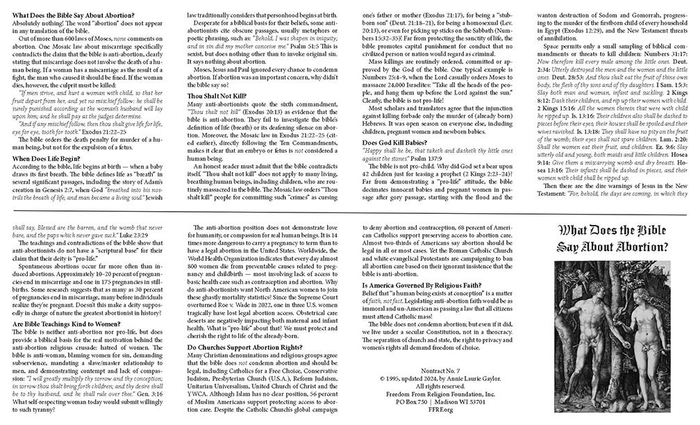 Out of more than 600 laws of Moses, none comments on abortion. One Mosaic law about miscarriage specifically contradicts the claim that the bible is anti-abortion, clearly stating that miscarriage does not involve the death of a human being. If a woman has a miscarriage as the result of a fight, the man who caused it should be fined. If the woman dies, however, the culprit must be killed: